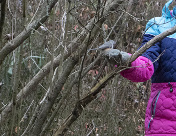 Yes, I am still amazed watching Annabelle do this... She has much patience and perseverance. I only ever knew one other person who has done this. It was my country line dance teacher, Phyllis, who is a few years older than I am. I watched her go out with seeds in her bare hand, and she “called” to the birds. She stretched out her hand and they came and landed on her hand repeatedly, picking up seeds and flying away to eat them. I remember there were Nuthatches, Chickadees, and Cardinals eating from her hand. I’m not sure if there were other birds.. She gave me seeds and told me to stretch out my hand. She called out her special “bird call” and a bird actually landed briefly on my hand, took a sunflower seed, and flew away. I wish I had known when I was a child, that it was even possible, as I would have also spent countless hours doing it. Love, MeMe.